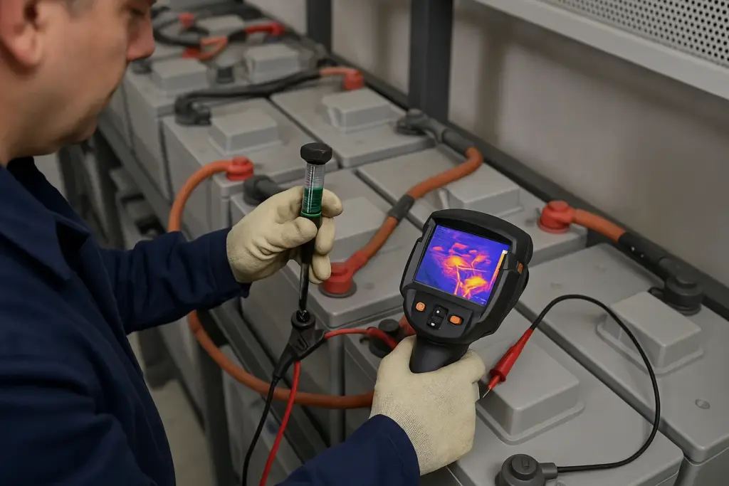 Δοκιμές φόρτισης/εκφόρτισης, μετρήσεις πυκνότητας ηλεκτρολύτη και θερμογραφικοί έλεγχοι για αξιόπιστη παροχή ενέργειας.